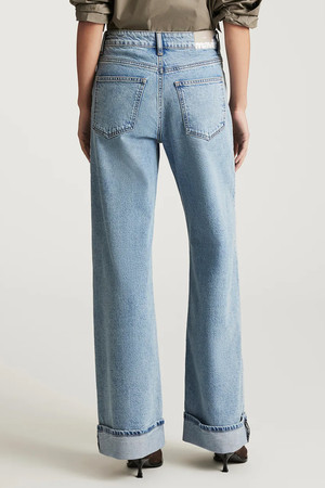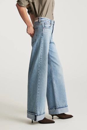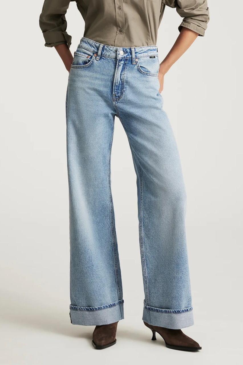 Florida Cuffed pairs a relaxed wide leg with a cuffed hem. The versatile fit features a waist-defining mid rise, fitting slim through the hip and loose through the leg. This pair features a lived-in light blue wash. By Mavi.