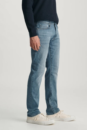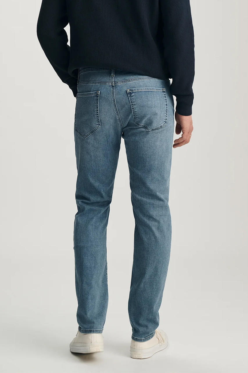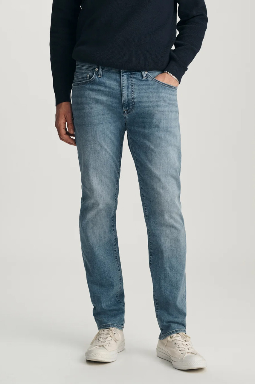 The perfect blend of a slim and straight leg. Marcus has a versatile shape, designed with a comfortable regular rise that runs straight throughout the hip, thigh, and leg opening. This pair comes in a classic medium blue wash with whiskering. By Mavi.