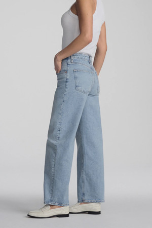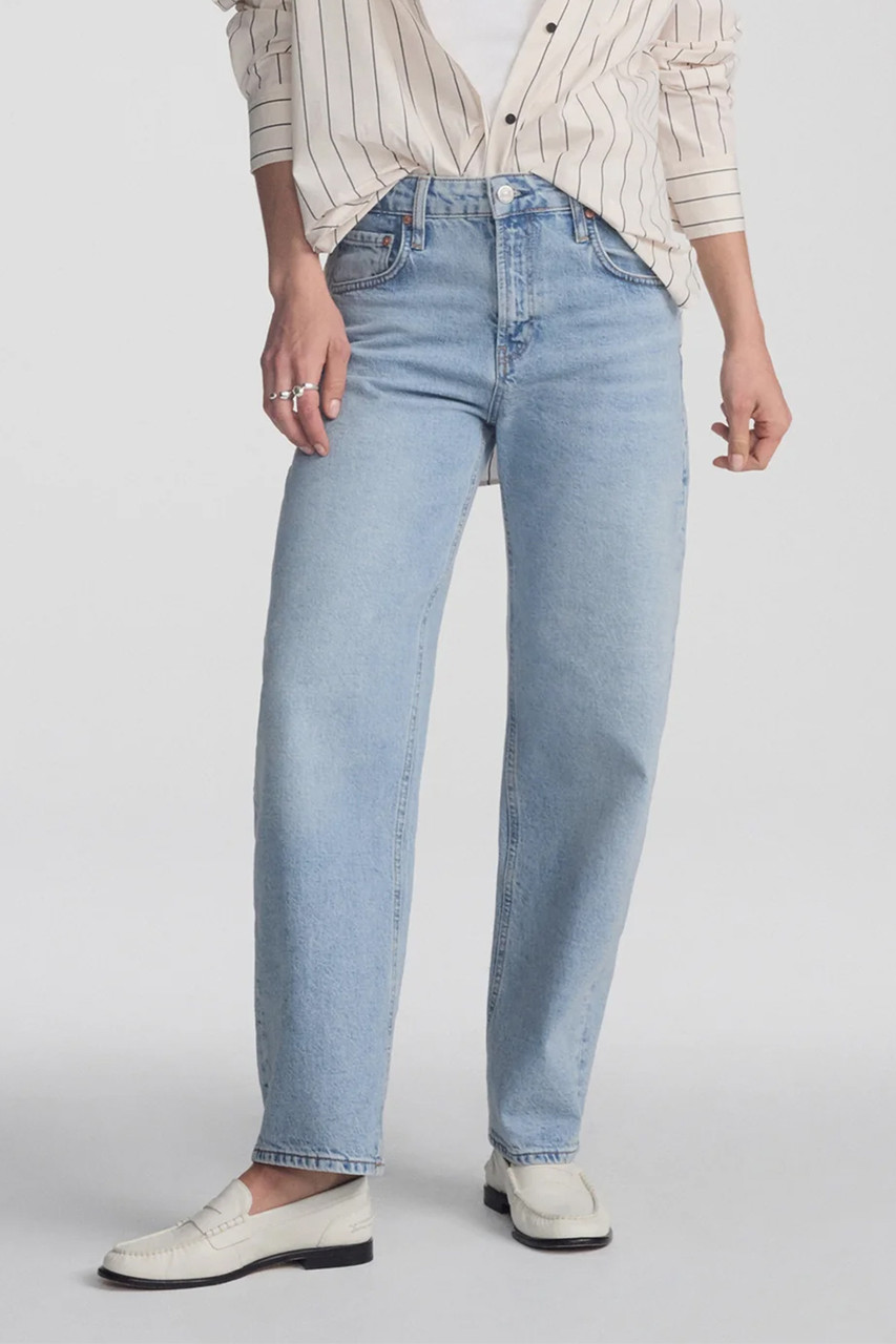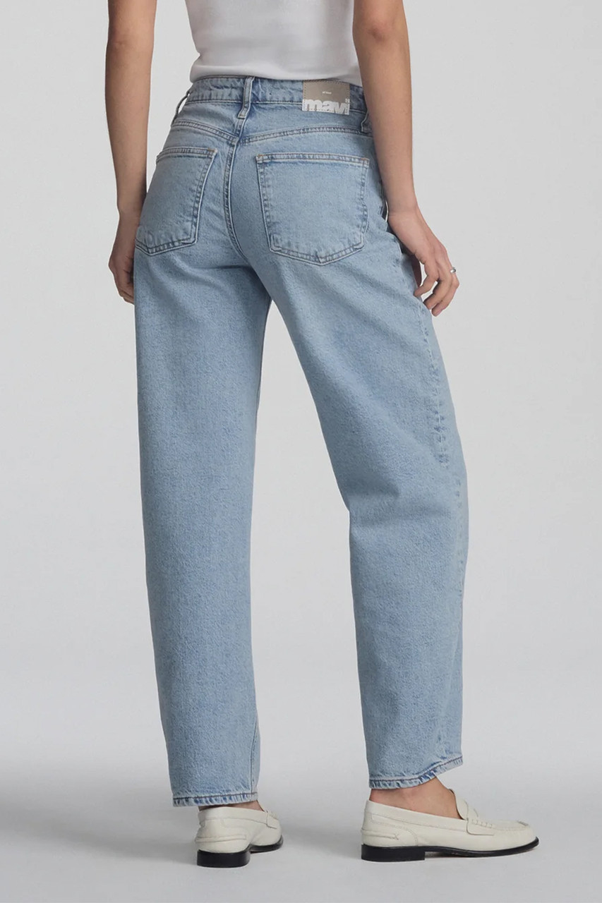 Nica features an easy barrel leg with subtle curves and a waist-defining high rise. It fits wider through the thigh and tapers toward the ankle for a flattering, laid-back look. This pair is finished in a lived-in light blue wash. By Mavi.Â