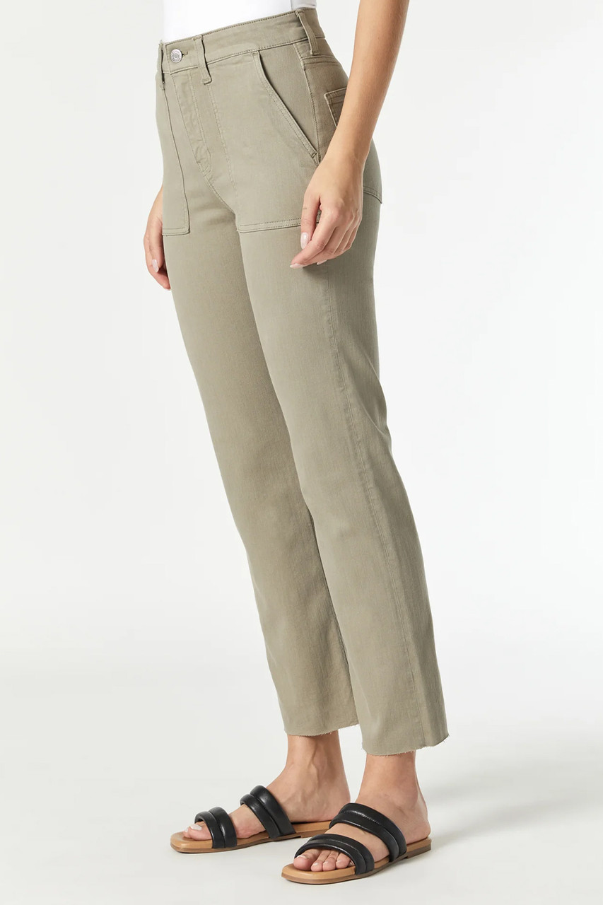 In Vetiver Twill High Rise, Front Pocket Straight Jeans 50% Organic Cotton, 36% Cotton, 12% Recycled Polyester, 2% Elastane Model is 5’10” Wearing W26/L29