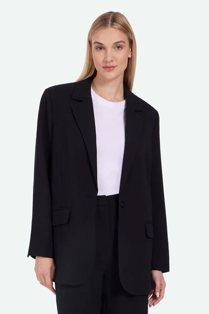 Novi is a modern classic blazer with tailored look and is crafted from 79% recycle polyester, 17% viscose and 4% elastane. The blazer has a slightly oversized fit and features shoulder pads and a minimalistic lapel collar. It is detailed with a single button, pockets and a slit at back. The model is 180 cm tall and wears a size 36. By Minimum.Â