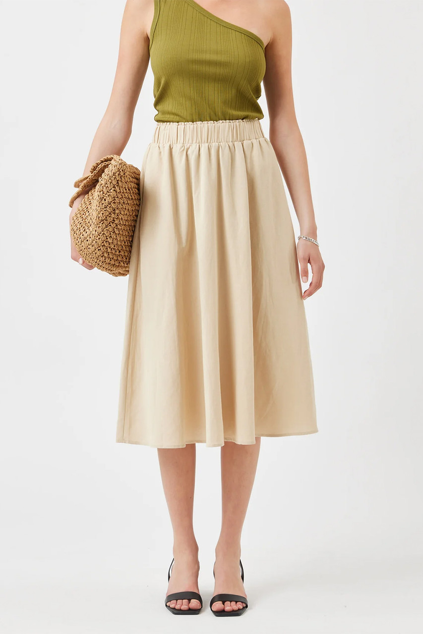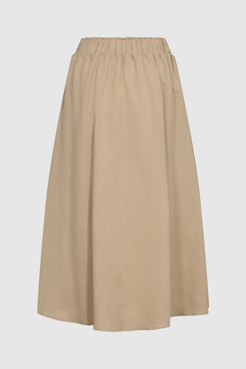 Ragnas is a midi skirt crafted from viscose and linen for a soft quality. The skirt has a simple fit and features an elastic waistband and two side pockets. The model is 180 cm tall and wears a size 36. By Minimum.Â