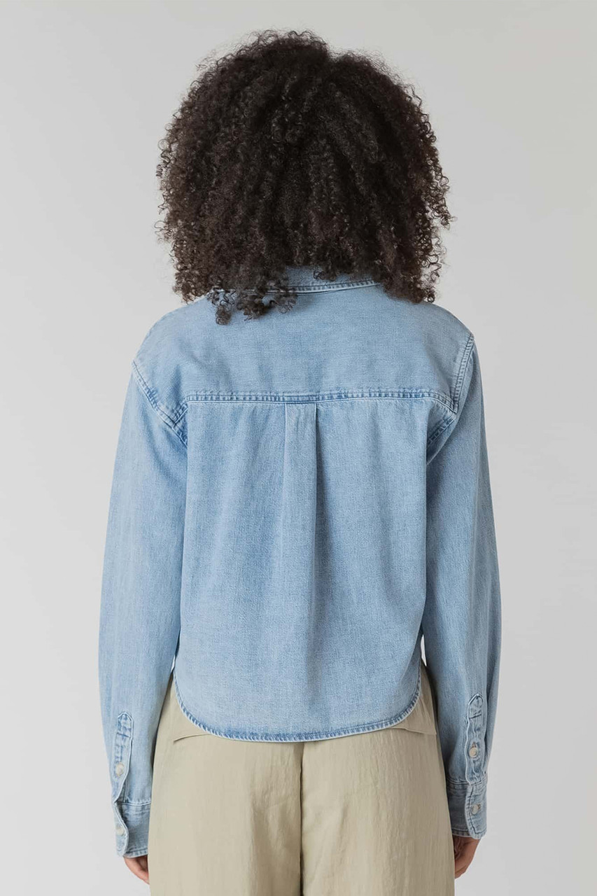 Throw on this lightweight denim inspired shirt and feel the breeze. Long sleeves keep the sun at bay while the cropped cut keeps things fresh and modern. Perfect for layering over a tank or wearing solo on warm days. Casual, cool, and ready for whatever the season throws your way. By Room 34.Â