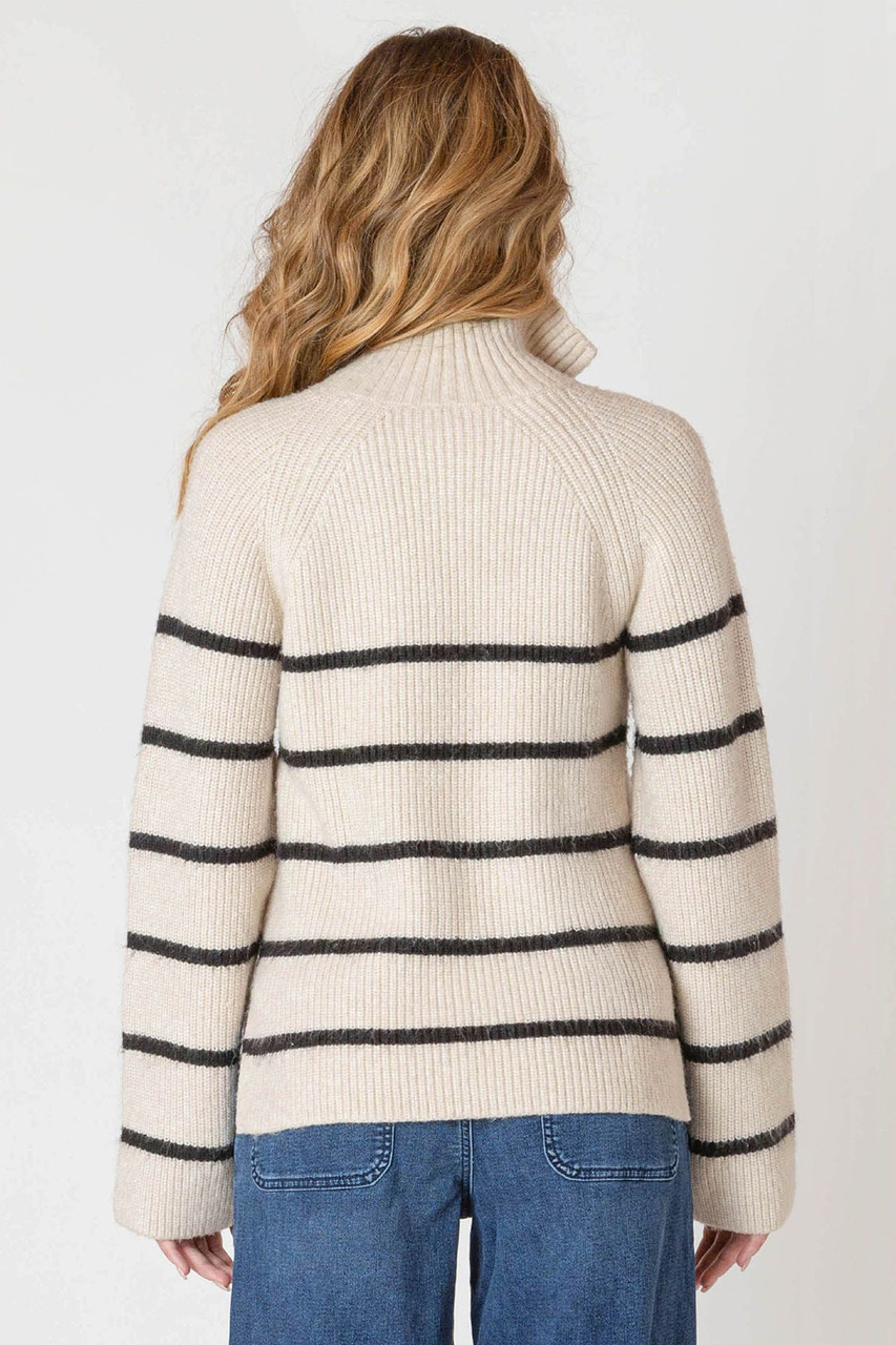 Embrace cozy vibes with the Room 34 Half Zip Longline Sweater, featuring a relaxed longline fit and stylish half-zip collar. Its oatmeal base, accented by bold black stripes, adds a playful twist to your casual look. Perfect for layering or solo wear, this sweater keeps you comfy while turning heads wherever you go. By Room 34.Â