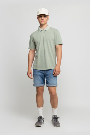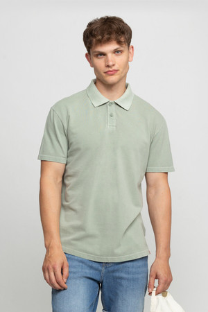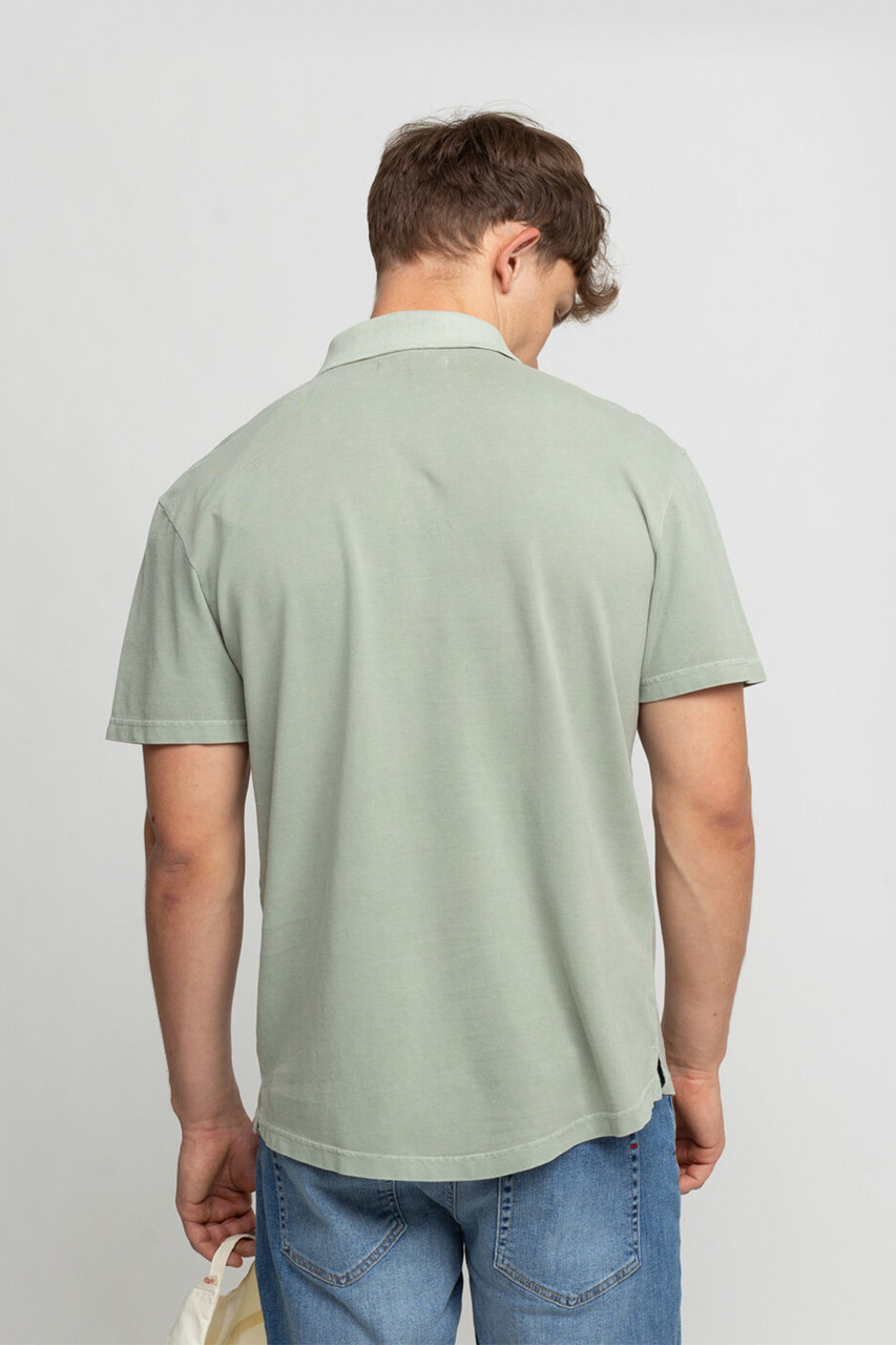 A garment dyed loose fit polo shirt made from an organic cotton pique fabric. Has a 2 button opening and a brand label. By RVLT.Â