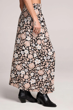 The Ida Midi Skirt showcases a classic silhouette with a romantic dark floral fabric, featuring a high slit on one side for effortless movement. Gathered at the waist for a flattering fit. By Saltwater Luxe.