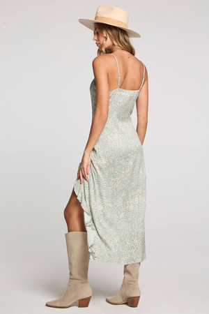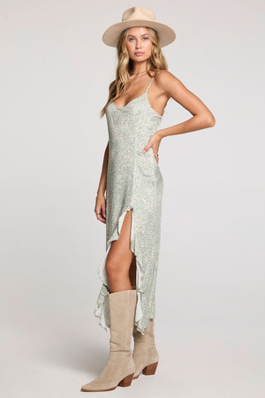 The soft sage fabric evokes a sense of nostalgia, while the playful ruffle at the high slit adds a touch of romance. By Saltwater Luxe.