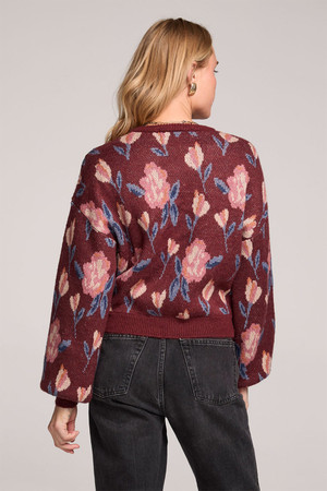 The Ronnie Sangria Sweater features a cropped, boxy fit with graceful gigot sleeves and a high neckline. Its nostalgic floral pattern on rich dark red fabric evokes romantic elegance, offering an effortless and sophisticated style statement. By Saltwater Luxe.