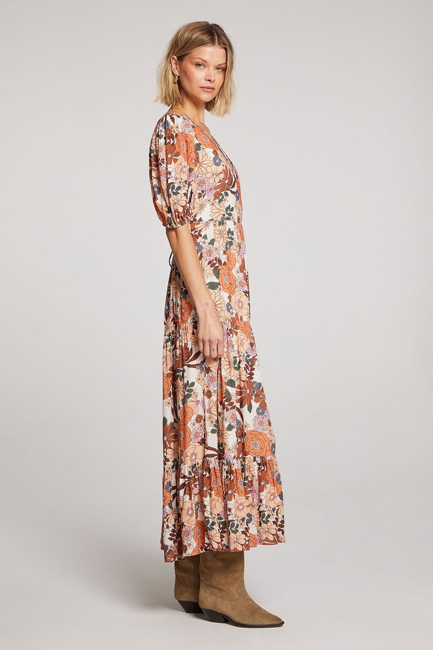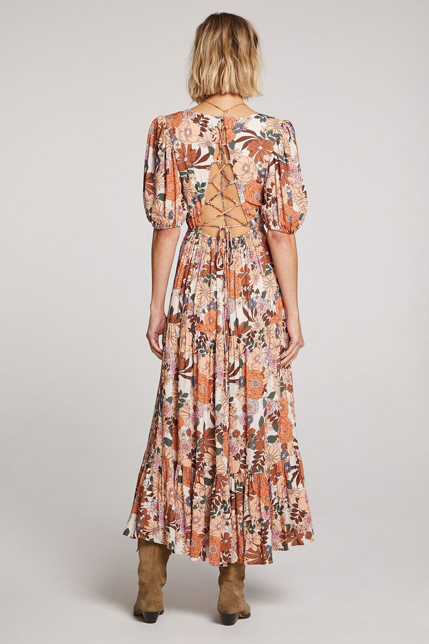 A brilliant landscape of blooming floral, Wynter is simple autumn splendor. The bodice is accented at the back with functional ties to create the perfect fit. Cascading tiers flutter in float, capturing the breeze and adding grace to your every gesture. By Saltwater Luxe.Â