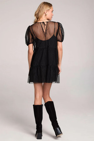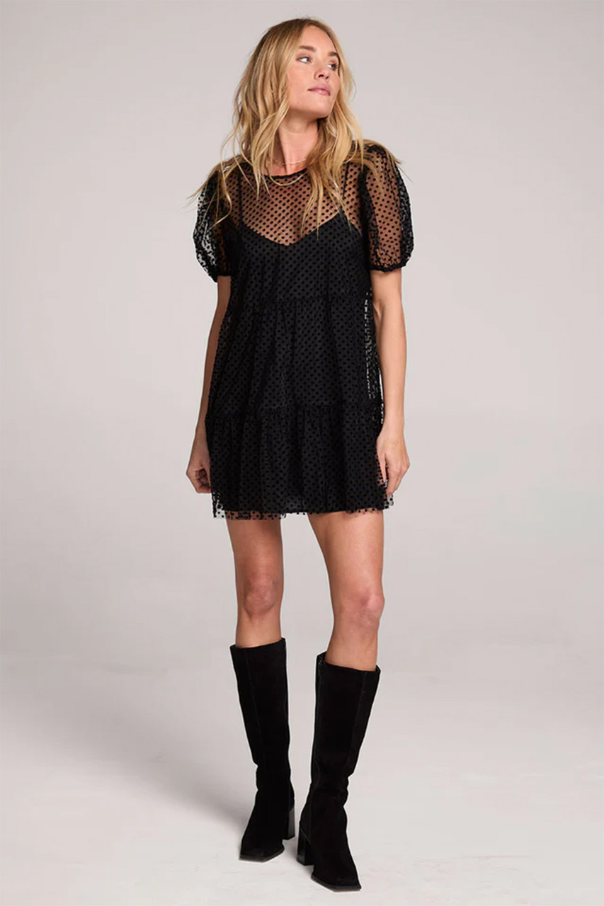 The Yaz Mini Dress features a layered mesh cutout outer layer over a sleek slip dress interior, creating a moody and romantic silhouette. By Saltwater Luxe.
