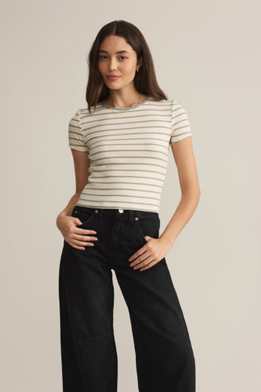 Classic ribbed knit short sleeve t-shirt. French inspired navy stripe design with contrast neckline. Slight fitted and on trend shorter length. Super versatile and chic! By Z Supply.