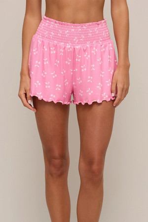 The Zoe Cherry Tank Bra in Pink Bisou is the perfect mix of sweet and sporty. Designed with an adorable cherry print on a bright pink background, this tank-style bra offers a flattering, comfortable fit for lounging or layering. Crafted from a buttery-soft fabric with a hint of stretch, it provides light support while keeping you cozy all day. These playful shorts bring a fresh twist to the classic cherry print, perfect for lounging. Made with high-quality fabric, these shorts are both comfortable and stylish! By 47 Brand.